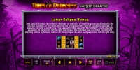 В Tales of Darkness: Lunar Eclipse задействованы простые картинки, джокер/скаттер, риск-игра на удвоение тематический бонус в формате бесплатных вращений на особых условиях.