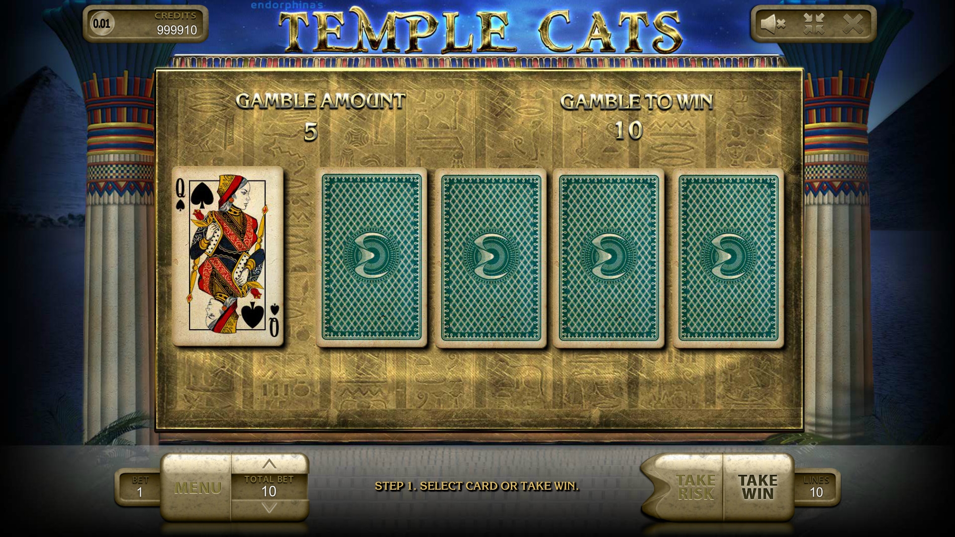 риск-игре на удвоение. Она запускается на побочном экране, где возникают пять карт с одной из них открытой. Ваша задача – наугад перевернуть любую из четырех закрытых карт. Если она будет старше открытой, ваши кредиты удвоятся. При равных номиналах объявляется ничья, а при неудачном стечении обстоятельств вы проиграете.