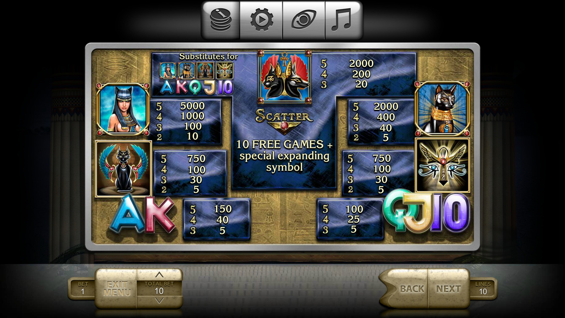 отличный игровой автомат, посвящен египетской тематике, а также любителям кошек тоже несомненно придется по душе, доступны особые символы, раунд на удвоение начисленной выплаты и фри-спины.