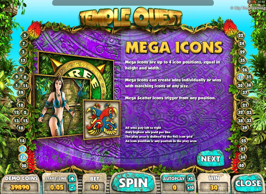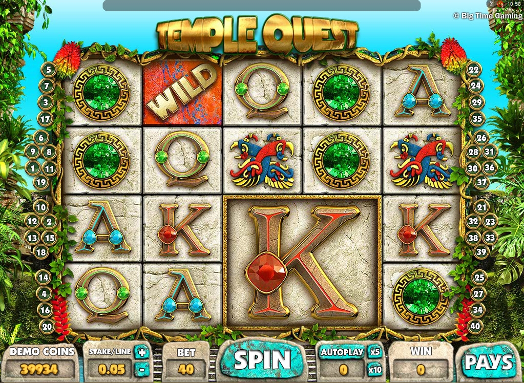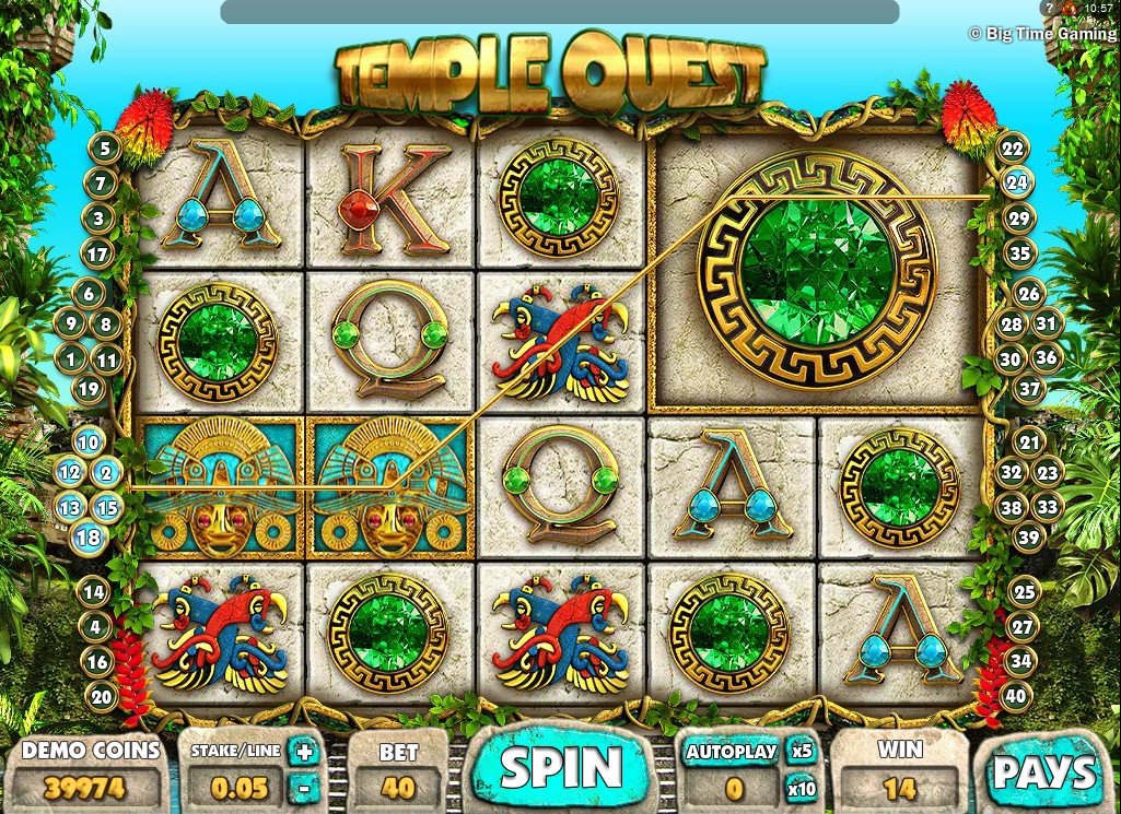 Temple Quest -Отличная игра а так же очень увлекательная со слотами культурой южноамериканских индейцев. Интереснейшее интернет-казино которая подарит приятные моменты и разогреет азарт очень простой и не сложной и интуитивно понятной игрой которая с информационной строкой с подсказками и коэффициенты расчета выигрышей по комбинациям.