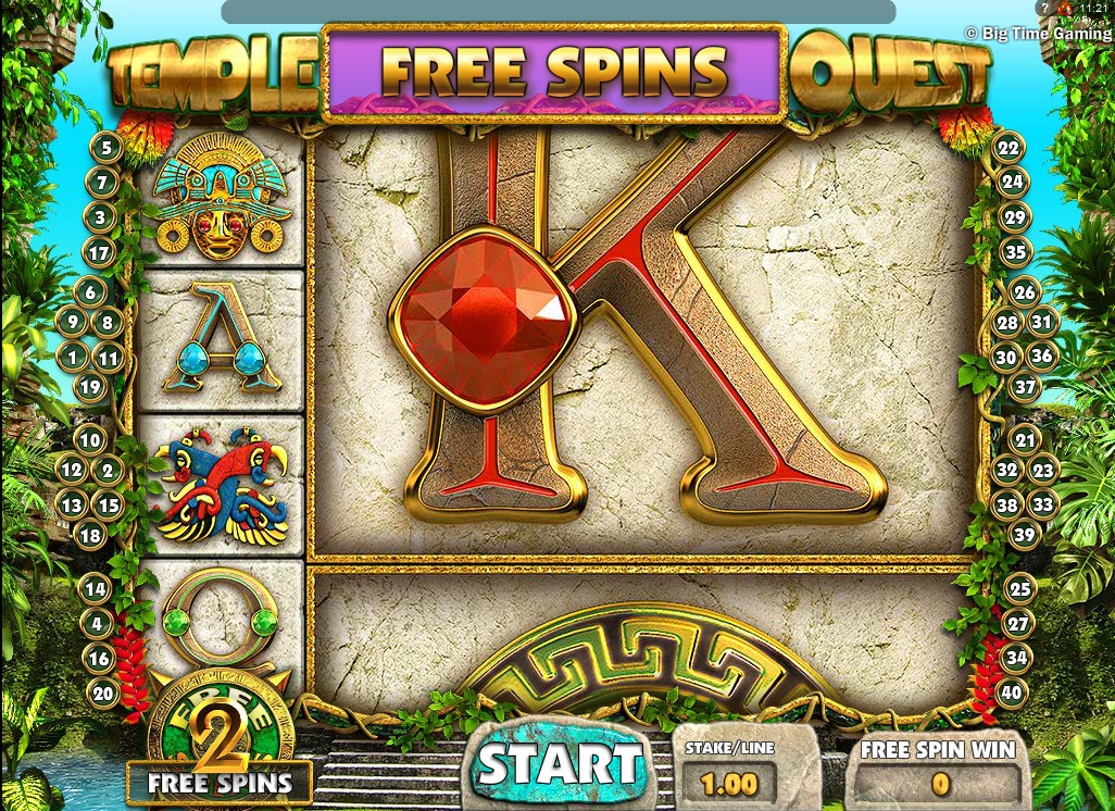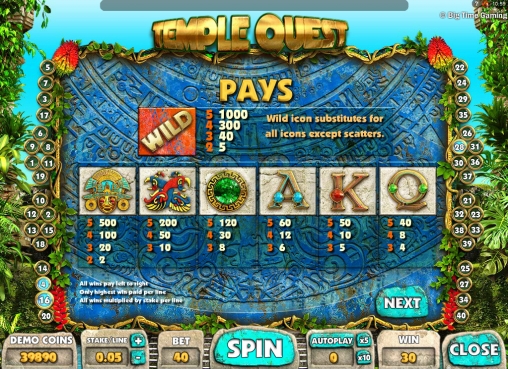 Temple Quest имеет пять барабанов и четыре ряда символов на экране. Играть на игровом автомате разрешается только по сорока линиям, сделав на все одинаковые ставки размером от одного цента до одного доллара. Таким образом, на спин принимается не более сорока долларов.