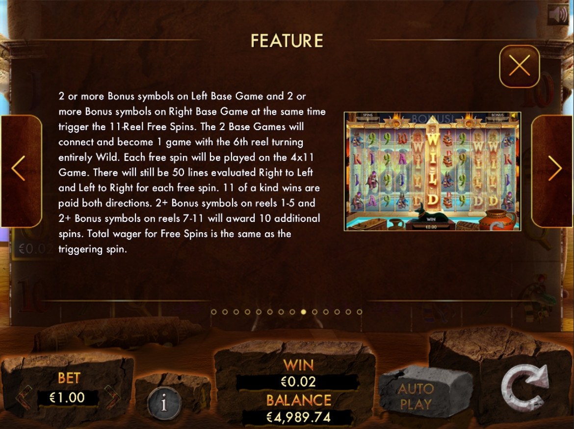 Данный раунд в Temple of Luxor имеет вид одиннадцати бесплатных вращений. С их началом между двумя экранами появляется еще один барабан. Он постоянно занят символом Wild снизу доверху. Соответственно, получается единый экран с одиннадцатью колонками.