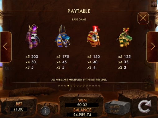 «Луксорский храм» - это слот с двумя экранами, на каждом из которых вращаются по пять барабанов. Когда они неподвижны, на обоих экранах видны по двадцать картинок. Играть можно по пятидесяти линиям в каждом случае.