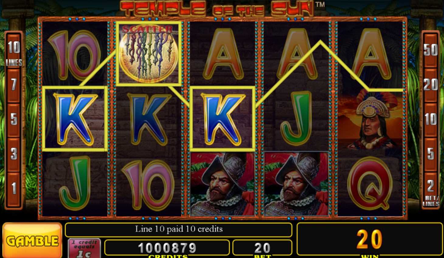 Игровой автомат Temple of the Sun представляет собой пятибарабанную модель с десятью активными полосами для формирования комбинаций и пятнадцатью символами на главном экране.