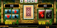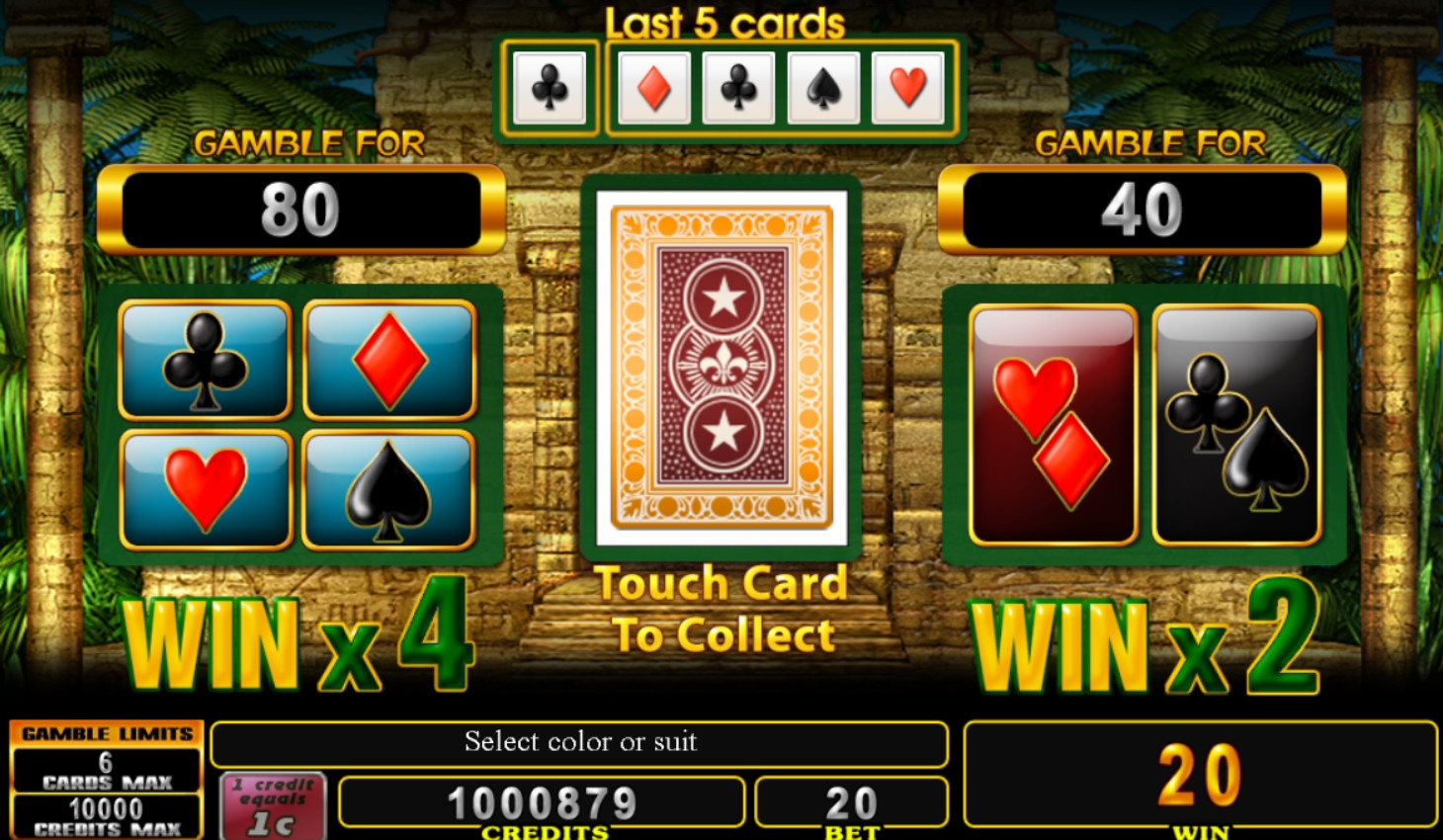 Игра по равным шансам запускается по желанию клиента. Она происходит на дополнительном экране, где появляется закрытая карты. Можно угадать ее цвет или масть, чтобы увеличить выплату в два или четыре раза соответственно. Если ответ неправильный, пользователь лишается текущей ставки.