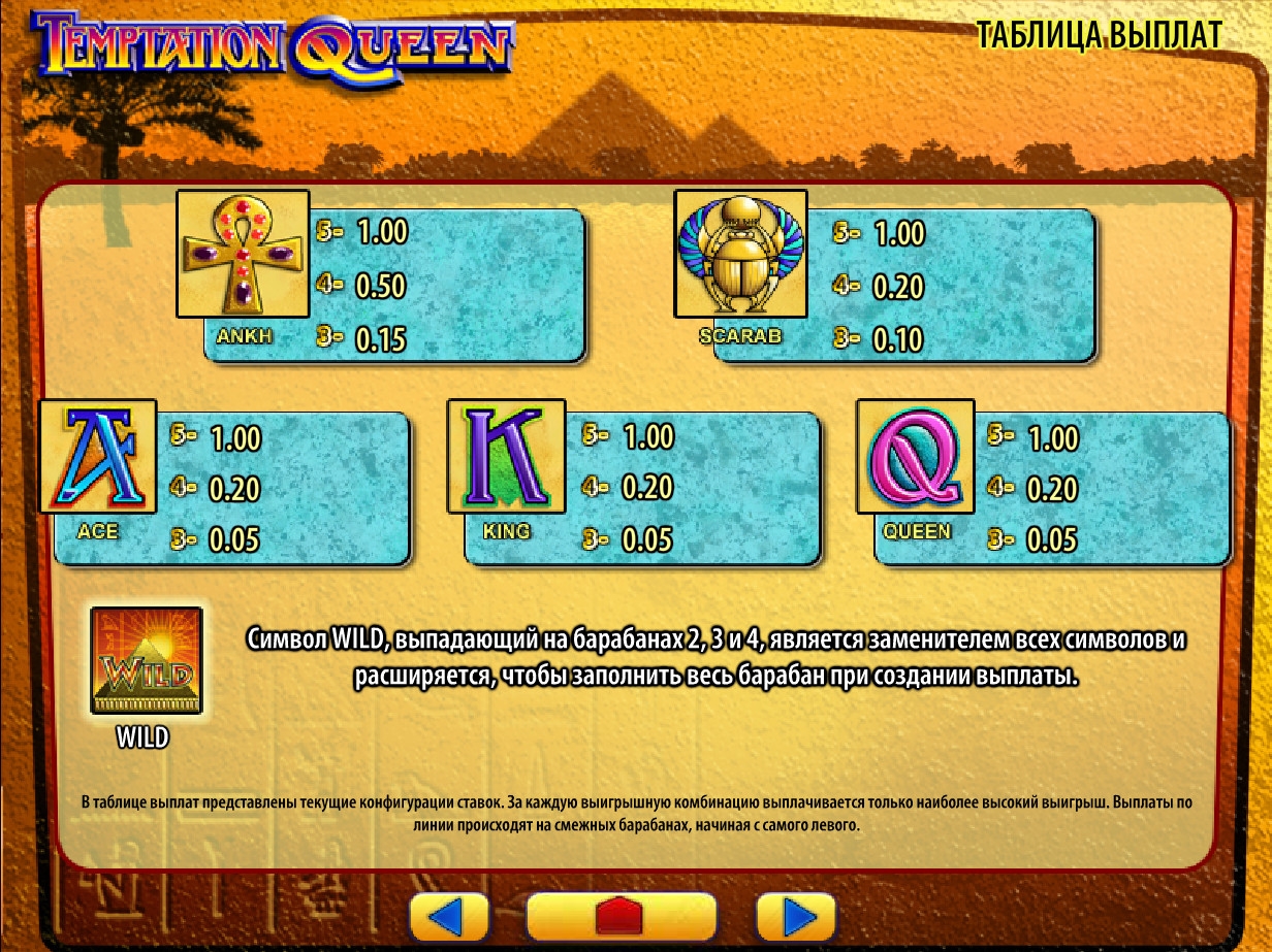 В обширном ассортименте онлайн-игр производства компании WMS Gaming есть модель с пикантным названием «Королева соблазна». Однако не ждите «перчинки» от этого видео-слота. Он представляет собой автомат на очень популярную египетскую тематику, а его главной героиней является, по всей видимости, царица Клеопатра. Мы думаем, он приглянется многим нашим читателям, так как предлагает неплохие опции геймплея и обладает прочими достоинствами, рассматриваемыми в обзоре.