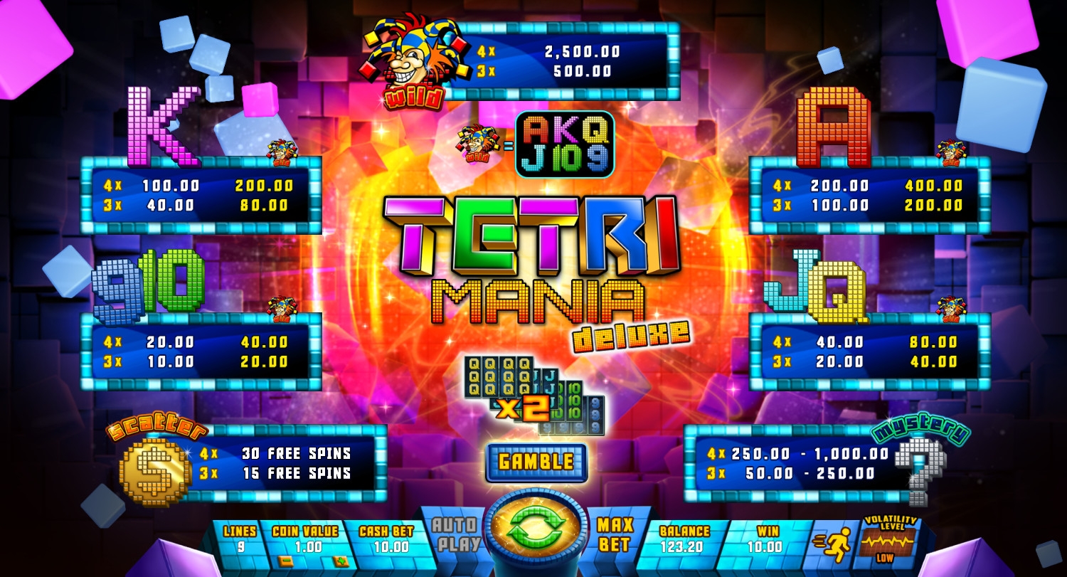«Тетри Мания Делюкс» - это игровой автомат с четырьмя барабанами, девятью линиями и двенадцатью иконками на центральном экране.