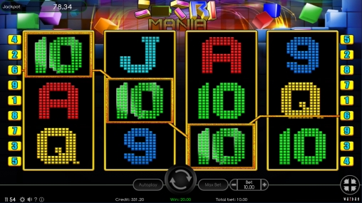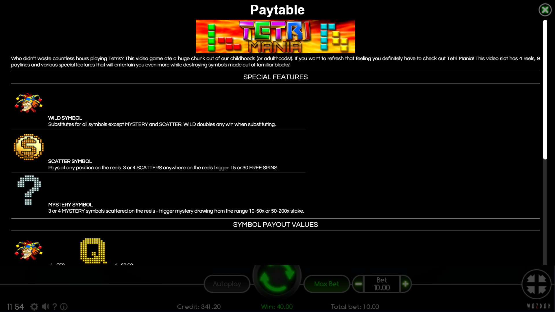 «Тетримания» является онлайновым видео-слотом с четырьмя барабанами, что является редкостью для современных автоматов. В нем девять активных линий, задействованных по умолчанию, и двенадцать символов на основном экране.