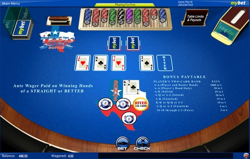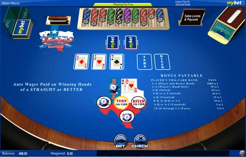 Вы можете играть в покер Texas Hold ‘Em Bonus на деньги и бесплатно в онлайн-казино MyBet. Также игра доступна в некоторых других заведениях, работающих на софте данного производителя. Протестировать онлайн-покер без регистрации по условным ставкам можно прямо на Casinoz.