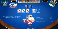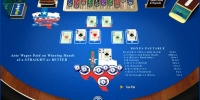 Довольно удачный вариант покерного автомата, по моим прикидкам приемущество заведения тут минимальное, и если с умом пользоваться ставками на бонусных секторах, то выигрывать совсем не так и трудно. Разве что синий цвет стола необычен.