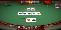 Если игрок продолжает, дилер выкладывает в центр стола три общих карты. Обе стороны могут использовать их для формирования комбинаций. Далее клиенту предстоит решить, поднимать ставку на одной анте или двигаться дальше, не ставя дополнительных денег на кон. Затем крупье сдает еще одну карту, и нужно будет снова принимать такое же решение.