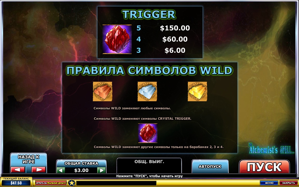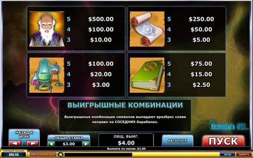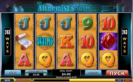 На экране автомата вы увидите алхимика, старинные манускрипты, химические колбы, книги с заклинаниями, а также буквы и цифры, обозначающие номиналы игральных карт.
