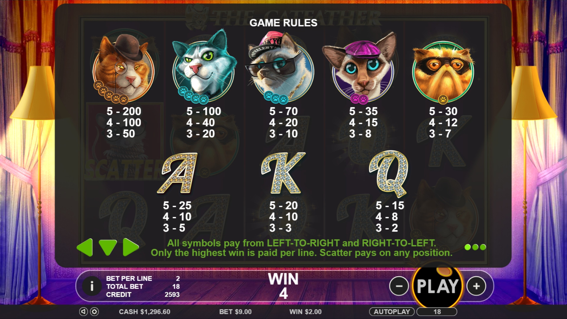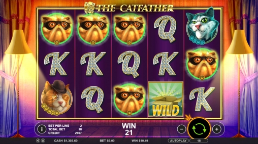 The Catfather имеет пять барабанов и девять линий для формирования на них оплачиваемых комбинаций. Все полосы задействованы по умолчанию, и вы не сможете менять их количество. Картинок на экране бывает одновременно пятнадцать (5х3).