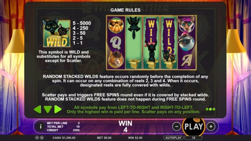 Далее о призовой функции Random Stacked Wilds. Она может начаться в любом обычном спине на любом из трех средних барабанов. В одной или нескольких колонках появятся коробки, из которых выпрыгнет котенок. Он сдерет все три картинки в данном столбце, заменив их на стекированный Wild. Далее этот символ будет участвовать в формировании комбинаций. В бесплатных спинах эта опция не действует.