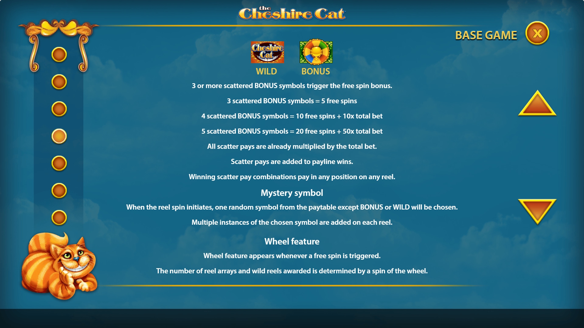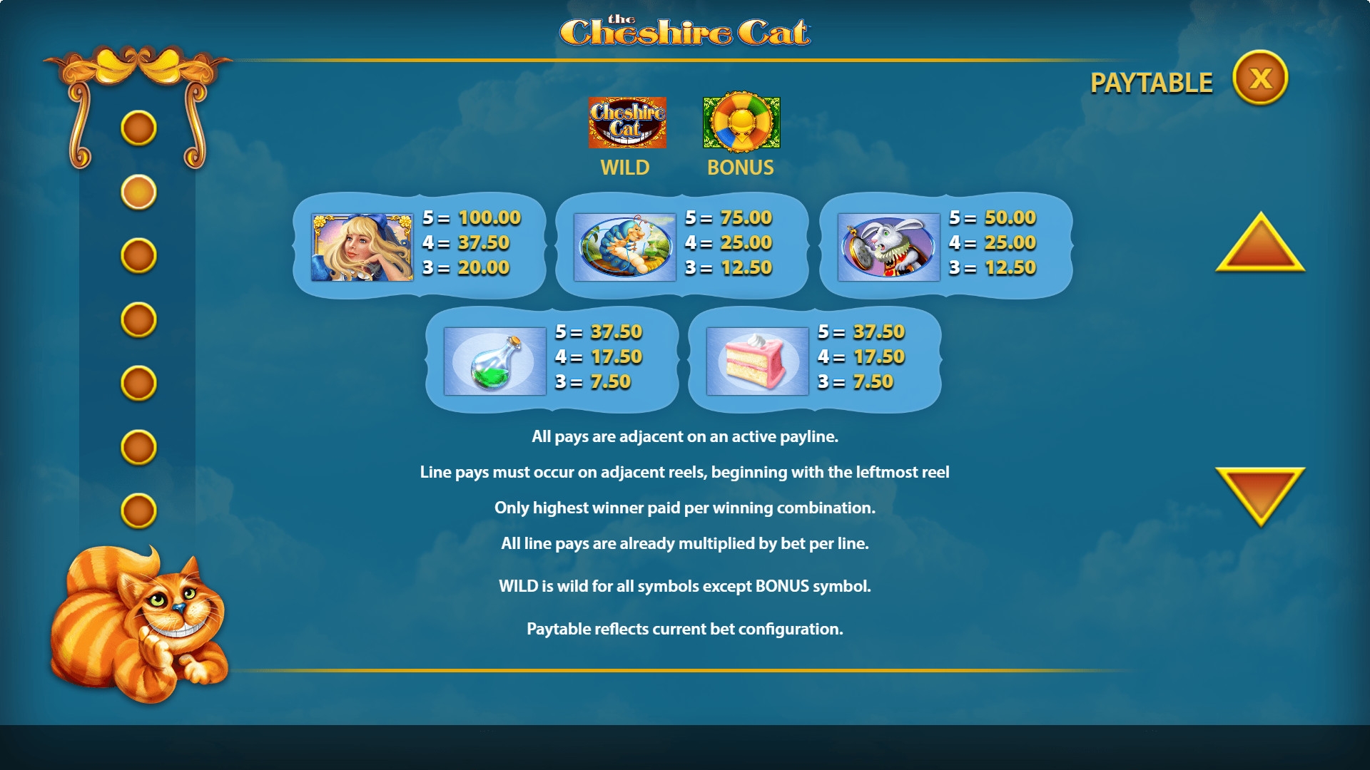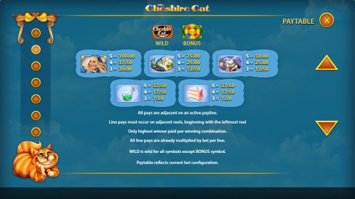 - Wild (логотип The Cheshire Cat) тоже представлен на барабанах вертикальными полосами. Он сам образует цепочки и помогает формировать последовательности из других элементов, заменяя недостающие. Джокер не используется вместо бонусных символов.