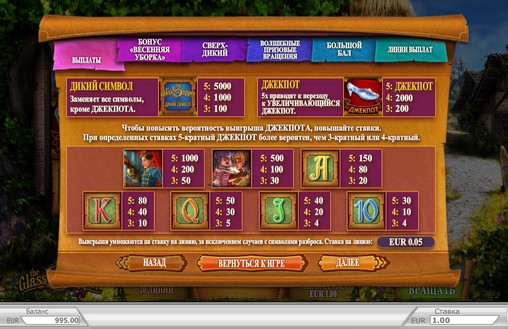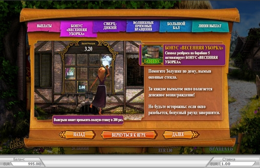 В бонусной игре «Весенняя уборка» Золушка будет мыть окна. Вам нужно будет указывать ей, какие именно окна мыть. Если она справится с задачей в каждом случае, вы получите выплату. Игра продолжается до тех пор, пока очередное окно не разобьется. После этого все заработанные деньги будут переведены на ваш счет. Выплата в этом раунде может достигать двухсот суммарных ставок.