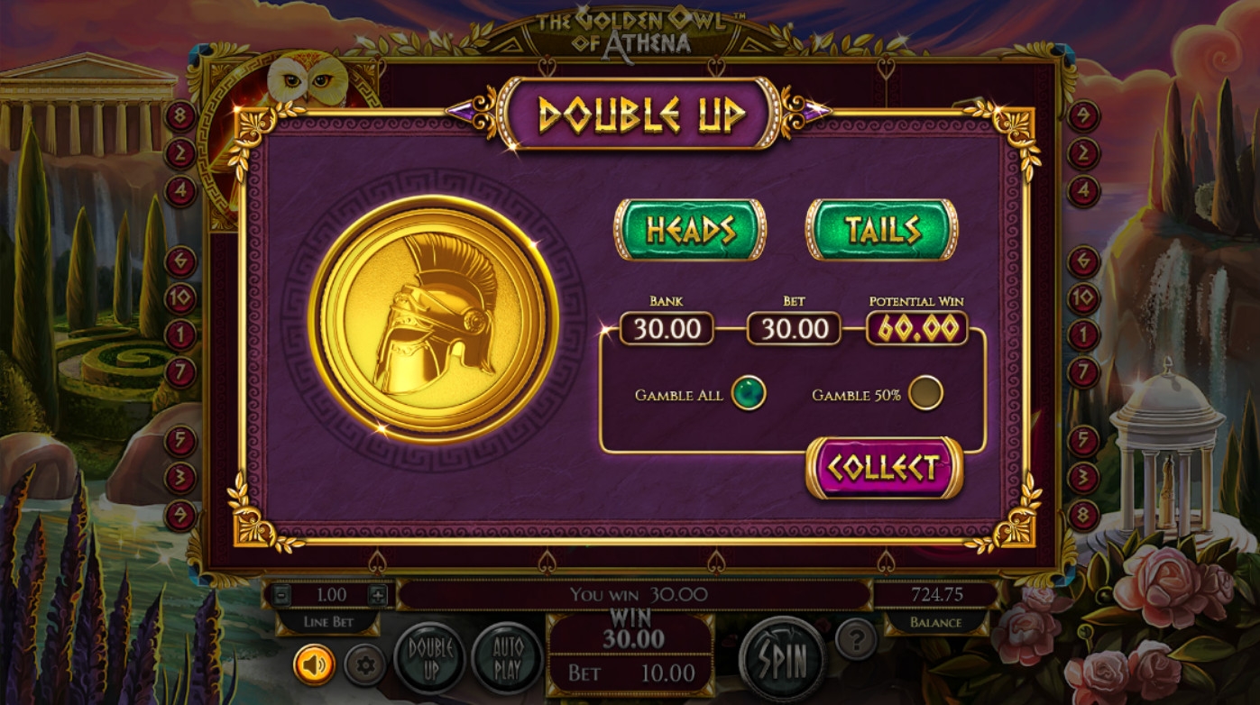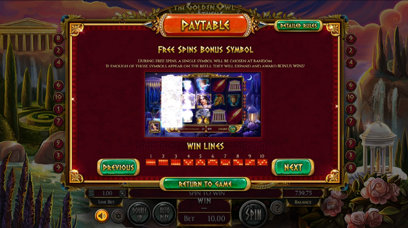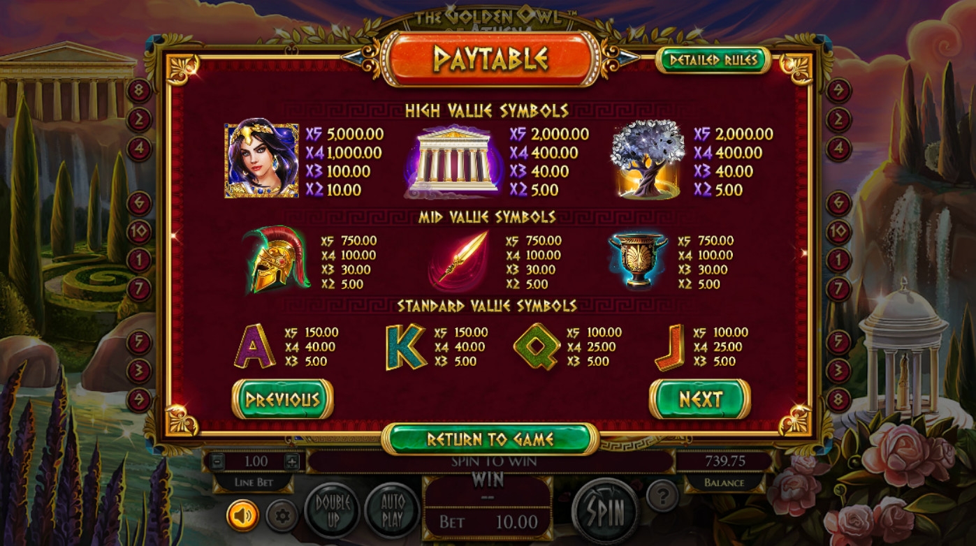 Видео-слот «Золотая сова Афины» имеет пять барабанов, десять фиксированных линий и пятнадцать ячеек для символов на основном экране.