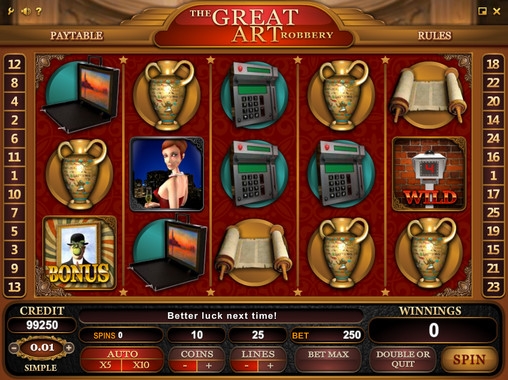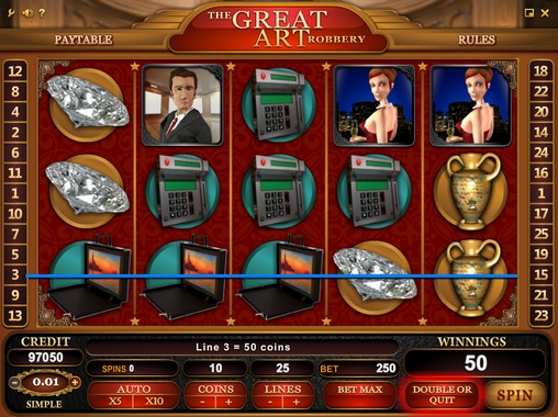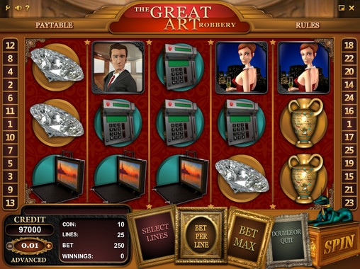 The Great Art of Robbery – пятибарабанный игровой автомат с двадцатью пятью линиями. Варьировать количество активных линий пользователь может по собственному усмотрению. Ставка на линию также определяется клиентом. Она может быть от одной до десяти монет номиналом от одного до пятидесяти центов. Следовательно, играть на игровом автомате The Great Art of Robbery можно по максимальной ставке в сто двадцать пять долларов.