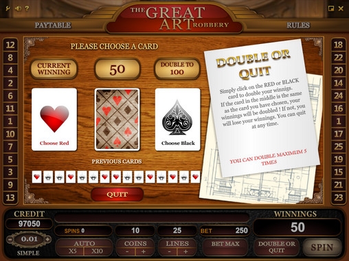 Общую выплату за спин можно попытаться увеличить в риск-игре видео-слота The Great Art of Robbery. Здесь нужно угадывать цвет закрытой карты. Если вам это удастся выигрыш удвоится. Если нет, вы проиграете ставку.