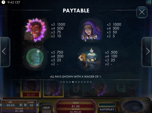 На экране видео-слота «Великий мастер исчезновений» можно увидеть улыбающегося дьявола, цыганку-предсказательницу, джинна в магическом шаре, череп со свечой и разноцветные номиналы карт от девятки до туза.