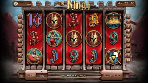 На барабанах игрового автомата The King можно увидеть седого рыцаря с мечом, рыжеволосую девушку с луком, сундук с сокровищами, золотой шлем, щит с мечами, а также набранные готическим шрифтом номиналы карт от девятки до туза.