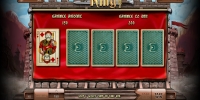 Общую выплату можно либо забрать, либо попытаться ее увеличить в игре по равным шансам. Она открывается на дополнительном экране, где появляются пять карт. Открыта одна из них. Вам нужно выбрать любую из четырех оставшихся. Если она будет старше карты дилера, выплата удвоится. Если младше, вы лишитесь ставки. При равных номиналах объявляется ничья. Играть можно несколько раз подряд, но ошибаться нельзя.