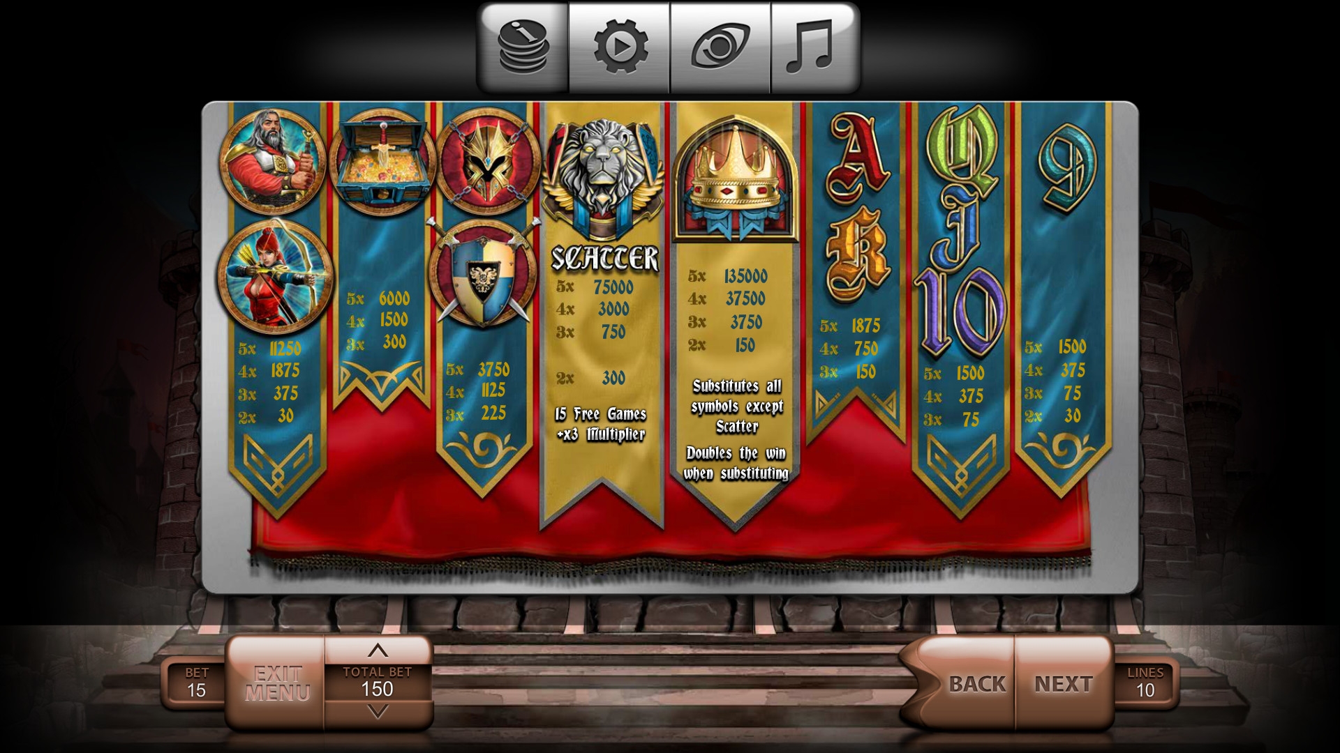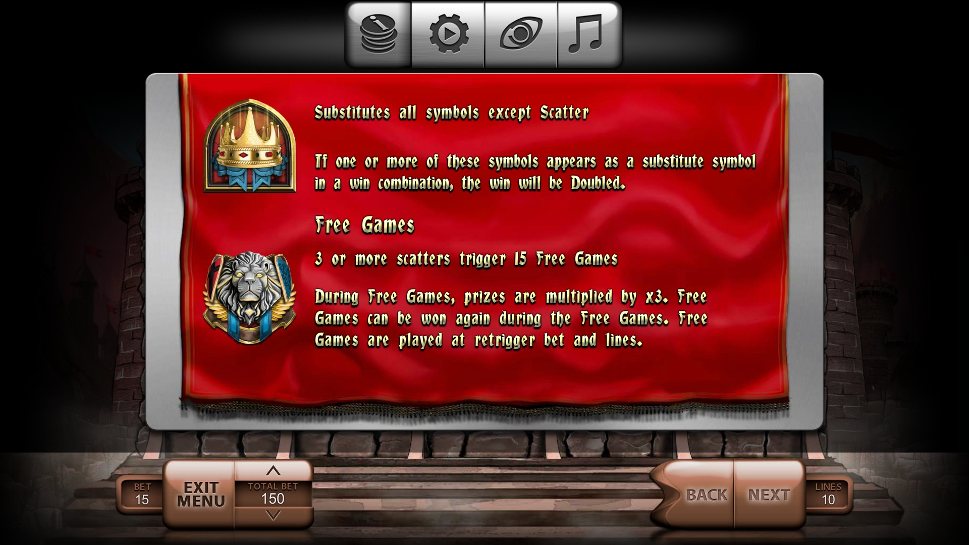 Есть также два специальных элемента: Wild (корона) и Scatter (герб с мордой льва). О них чуть подробнее:
