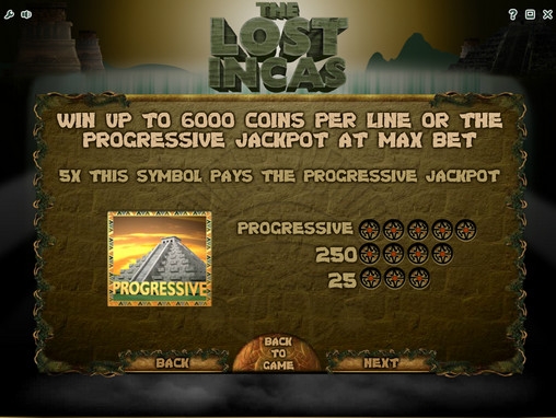 В видео-слоте The Lost Incas разыгрывается накопительный джек-пот. Чтобы его получить, нужно собрать на активной линии комбинацию из пяти специальных символов с изображением пирамиды. При этом играть нужно по максимальной ставке. В противном случае, сумма выплаты составит шесть тысяч монет установленного номинала.