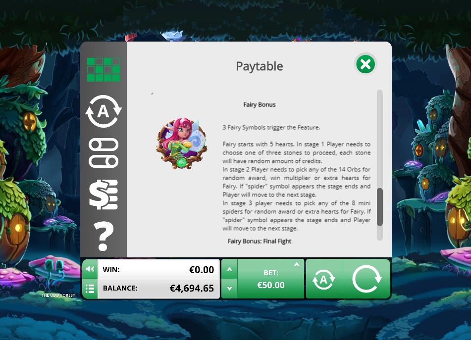 игровом автомате The Odd Forest пять виртуальных барабанов с картинками нескольких типов. Они вращаются и определяют набор символов, из которых на пятидесяти активных полосах могут составляться оплачиваемые комбинации.
