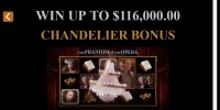 - Chandelier Bonus – На экран обрушивается люстра. Она заполнит до трех колонок символами Wild.