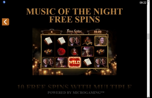 - Music of the Night – Начинаются десять бесплатных вращений. В каждом из них активируются специальные возможности: множители до х4, дополнительные джокеры и экстра-спины.