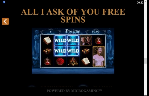 - All I Ask of You – Запускаются десять фри-спинов с Dancing Wilds. Кристина и Рауль становятся джокерами. Оказавшись рядом друг с другом, они будут танцевать. В результате образуются дополнительные множители или стекированные Wild, заполняющие несколько смежных позиций или целые колонки.