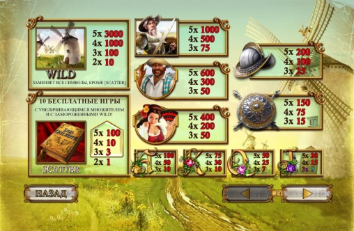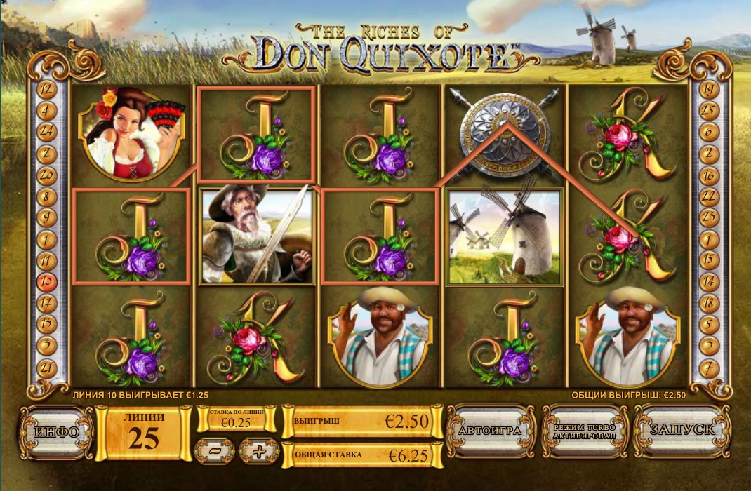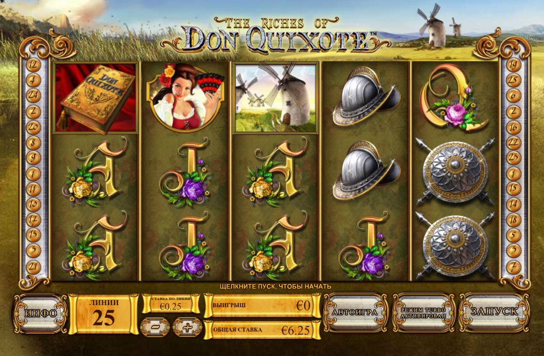 Вы сможете протестировать русскоязычную версию The Riches of Don Quixote без регистрации по условным ставкам в Europa casino. Там же можно играть на деньги.