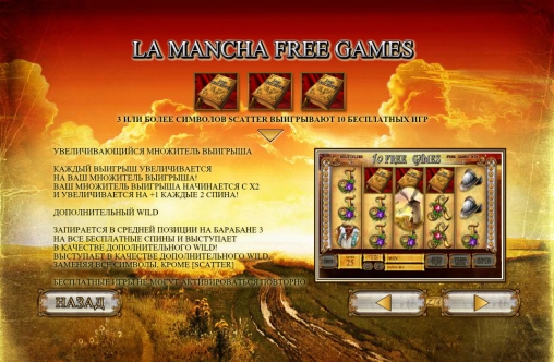 Специальными элементами являются Wild (мельницы, с которыми сражался Дон Кихот) и Scatter (старинное издание книги). Об их возможностях далее: