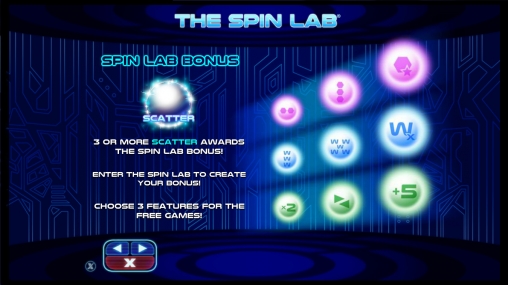 На барабанах видео-слота The Spin Lab можно увидеть формулы, изображении атомов, хромосом и прочие тематические картинки. Также на них представлены разноцветные номиналы карт от девятки до туза. Особыми возможностями обладают Wild и Scatter (их легко узнать по соответствующим надписям). О них поговорим далее: