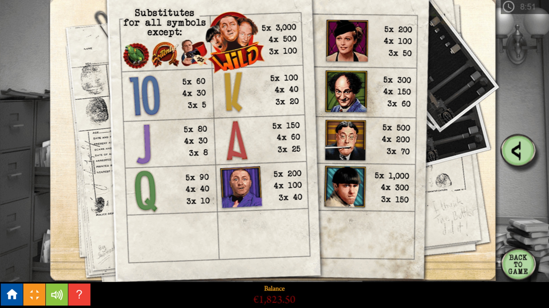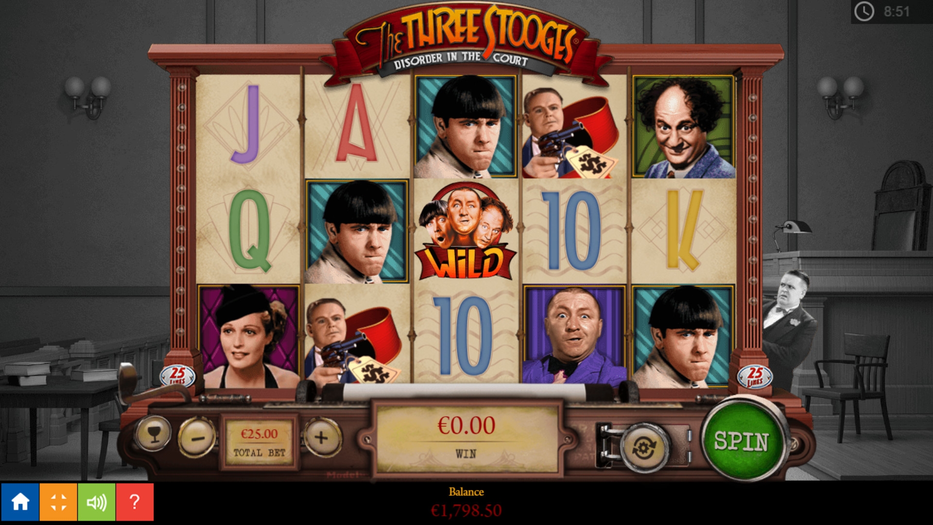 Регулировать можно размер экрана и звук. Скачивать игровой автомат The Three Stooges: Disorder in the Court не нужно.
