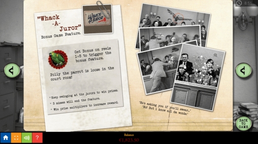 - Whack a Juror – На дополнительном экране появятся присяжные в зале суда. Их нужно будет лупить по головам молотком. Удачная попытка приносит множитель случайно выбранного размера. Игра продолжается, пока не окажется три промаха. Общая выплата рассчитывается по аккумулированным коэффициентам и ставке.