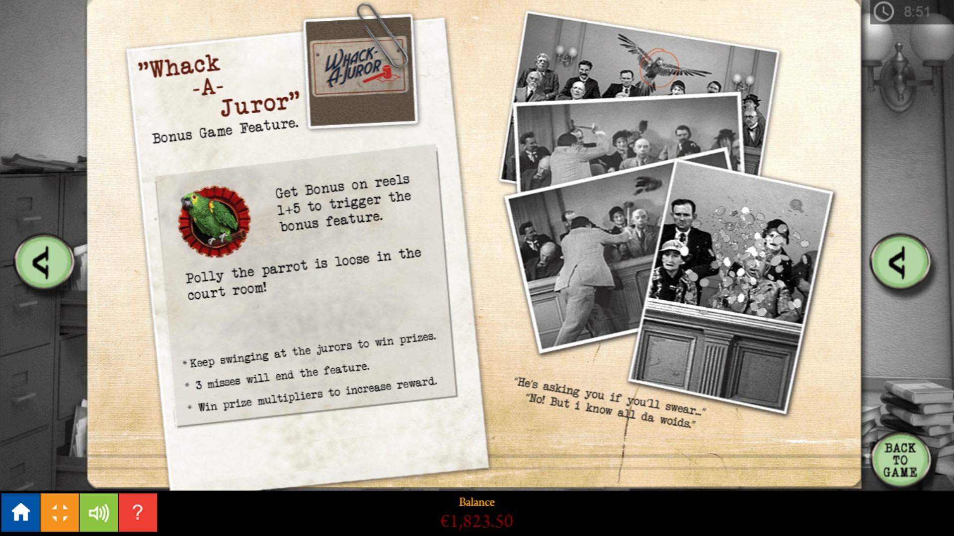 - Bonus (зеленый попугай) выпадает лишь на первом и пятом барабанах. Если он появляется в двух колонках одновременно, стартует бонусный раунд Whack a Juror.