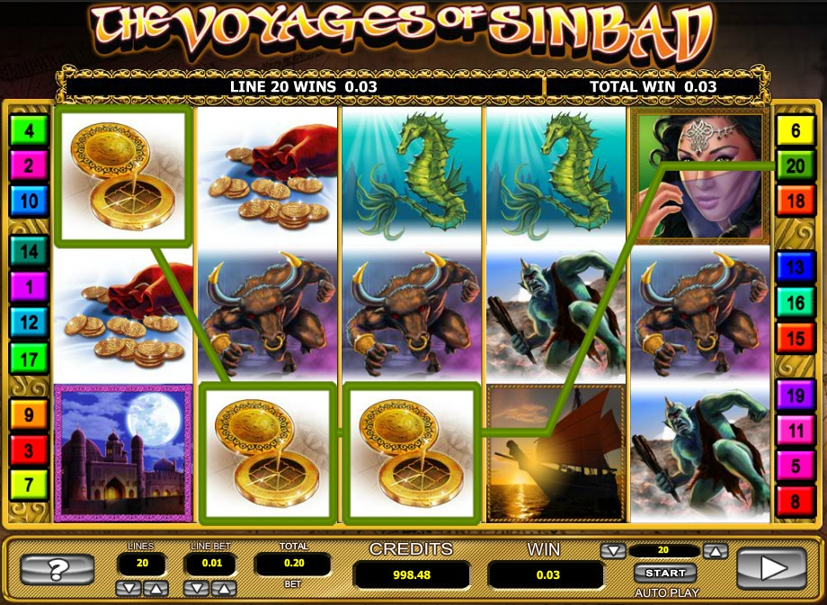 Видео-слот The Voyages of Sinbad предлагают заведения, использующие софт Leander Games. Например, испытать игровой автомат без регистрации по условным ставкам или же играть на нем на деньги после открытия счета можно в интернет-казино NetBet.