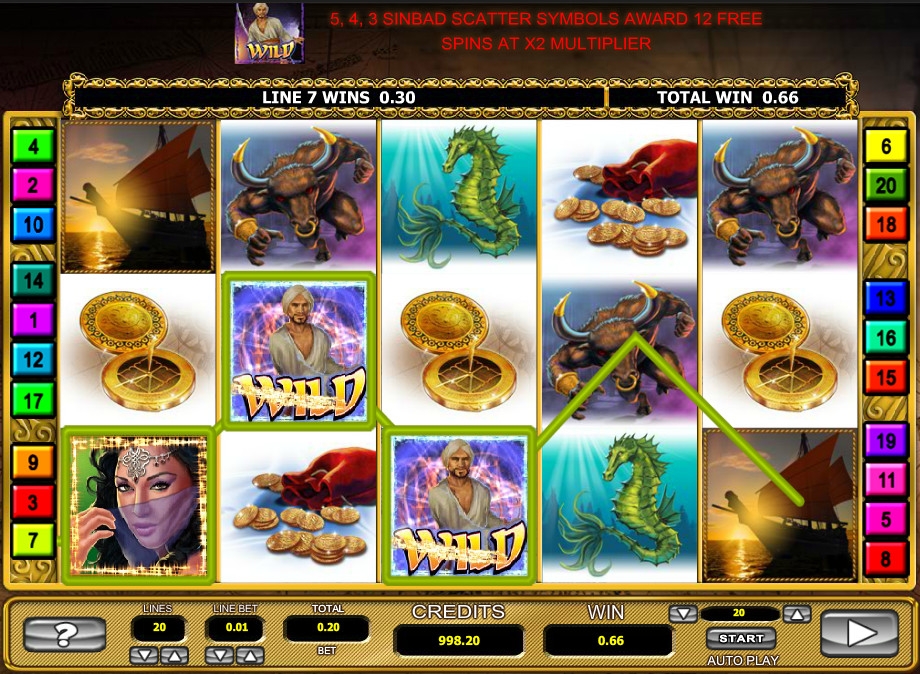 Синдбад является особым символом, который оплачивается независимо от расположения на барабанах, а сумма выигрыша рассчитывается по общей ставке (три, тридцать или триста). Кроме того он заменяет другие обычные картинки, если оказывается в подходящей позиции. Таким образом, Синдбад одновременно играет роль Wild и Scatter.