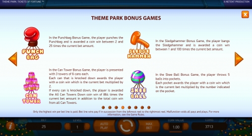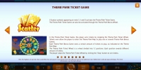 В Theme Park: Tickets of Fortune есть несколько бонусных опций. Сначала поговорим о Theme Park Bonus Wheel и Theme Park Ticket Game. Они оба запускают разные колеса с секторами. Выиграть здесь можно денежные призы или право на участие в одной из шести тематических игр, выдержанных в духе популярных аттракционов: