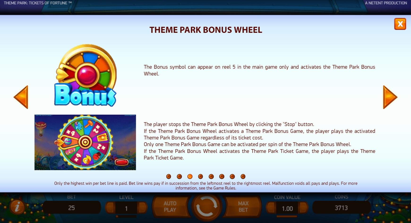 - Bonus (колесо фортуны) – Картинка есть в пятой колонке. Выпадая в любой ячейке, он тоже запускает Theme Park Bonus Wheel.