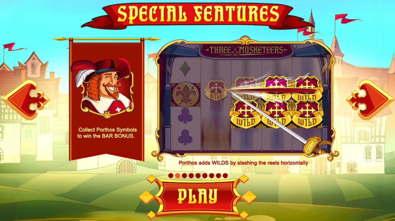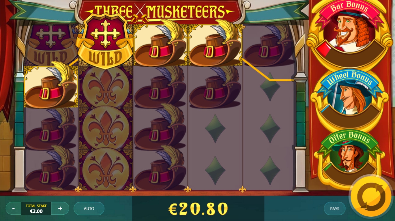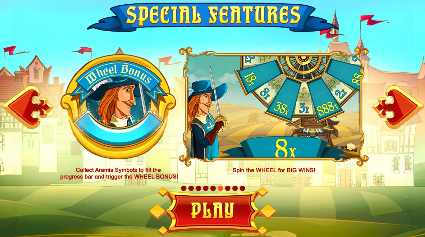 Набор предлагаемых в «Трех мушкетерах» игровых опций состоит из базовых картинок, джокеров и нескольких тематических бонусных розыгрышей.