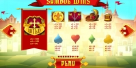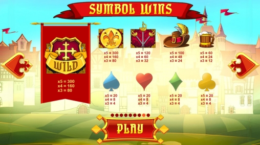 На барабанах видео-слота нарисованы карточные масти, кружка с пенистым пивом, шляпа с пером, три шпаги и герб. Картинки представлены вертикальными полосами, благодаря чему одинаковые элементы могут занимать даже все двадцать ячеек на экране.