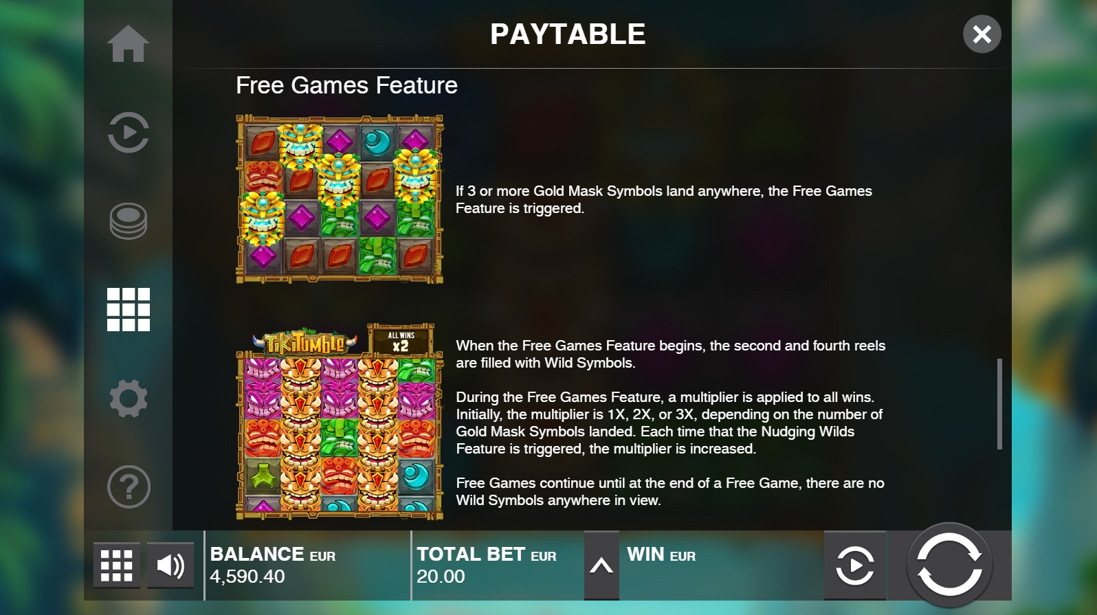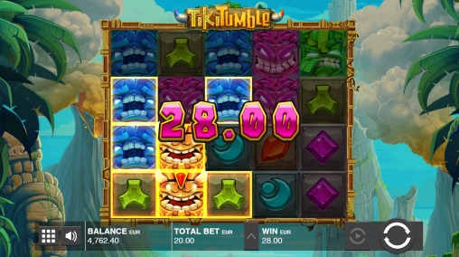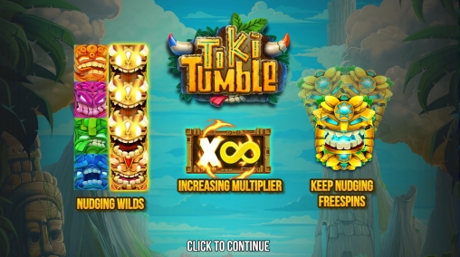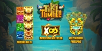 В игровом аппарате Tiki Tumble задействованы базовые изображения, стекированные джокеры, скаттеры, функция Nudging Wilds и бесплатные вращения.