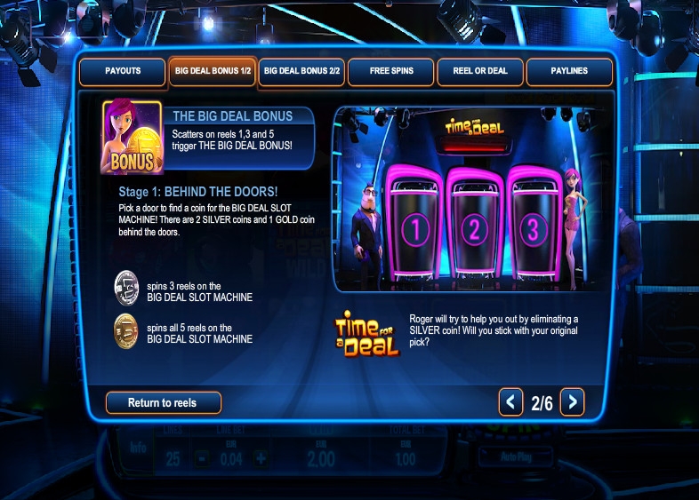 В бонусном раунде The Big Deal нужно открыть одну из трех дверей. За ними скрываются две серебряных монеты и одна золотая. Далее вы будете участвовать в розыгрыше на специальном игровом автомате. Если вы найдете серебряную монету, запускаться будут три барабана. Если вам достанется золотая монета, вращаться будут все пять барабанов. Выплаты будут начисляться по образовавшимся комбинациям. В этом же раунде можно стать обладателем накопительного джекпота.