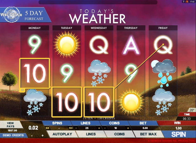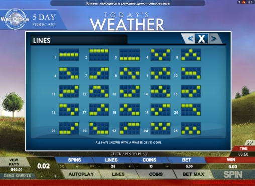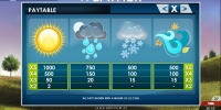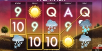 В Today’s Weather пять барабанов и двадцать пять линий, количество которых клиент может активировать по собственному усмотрению. Играть на игровом автомате он может, поставив на линию до десяти монет номиналом от одного до двадцати центов. Так что максимальная ставка на раунд ограничена пятьюдесятью евро.