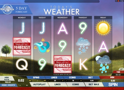 Компания Genesis Gaming выпустила бесплатный игровой автомат для онлайн-казино, посвященный теме, близкой каждому из нас, но все же необычной для видео-слотов. Речь идет о работе синоптиков, а модель, которой посвящена наша статья, называется «Погода на сегодня». Оформлена она в стиле таблиц, которые появляются в телевизионных передачах о прогнозах погоды, и даже бонусный раунд выдержан в том же духе. Предлагают данную модель онлайн-казино, работающие на платформе Quickfire, а наш обзор познакомит вас со всеми ее ключевыми особенностями.