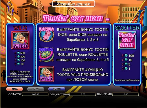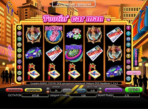 Tootin’ Car Man – видео-слот с пятью барабанами, двадцатью линиями (их количество можно изменять), тремя рядами картинок на экране, особыми символами, бонусными раундами, рискованной игрой по шансам и другими функциями.