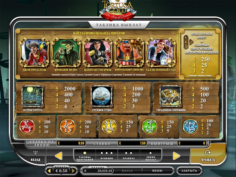 Самый дорогой символ в этой игре остров Тартуга, затем идет Грузовое судно, украденные сокровища, и конечно карточные символы A, K, Q, J и 10-ка.